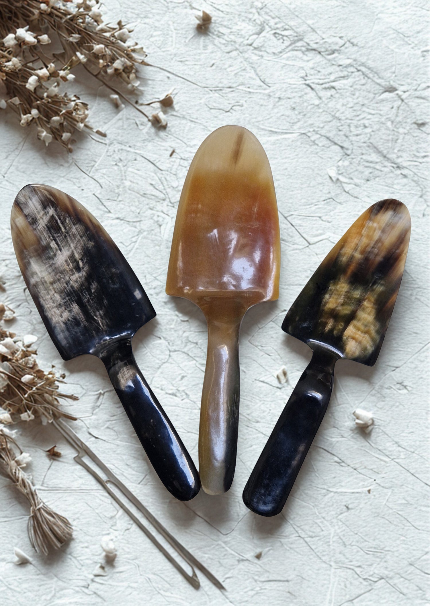 Voici nos pelles à tarte en corne de zébu de Madagascar